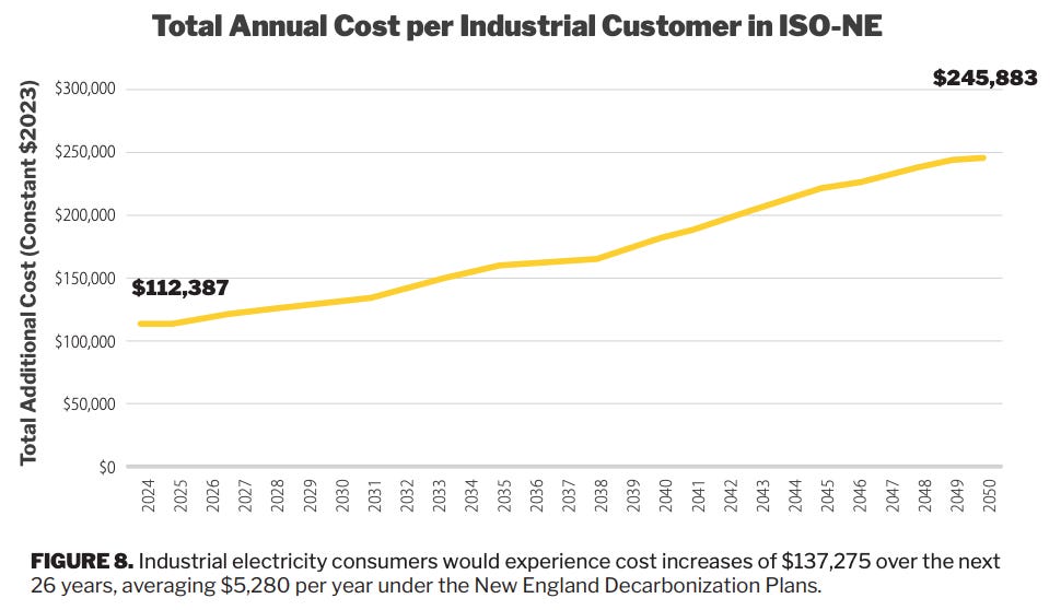This would likely continue driving large industries out of the New England region, which would spread the enormous costs of achieving net-zero and electrification over the remaining customers – mainly small businesses and families.