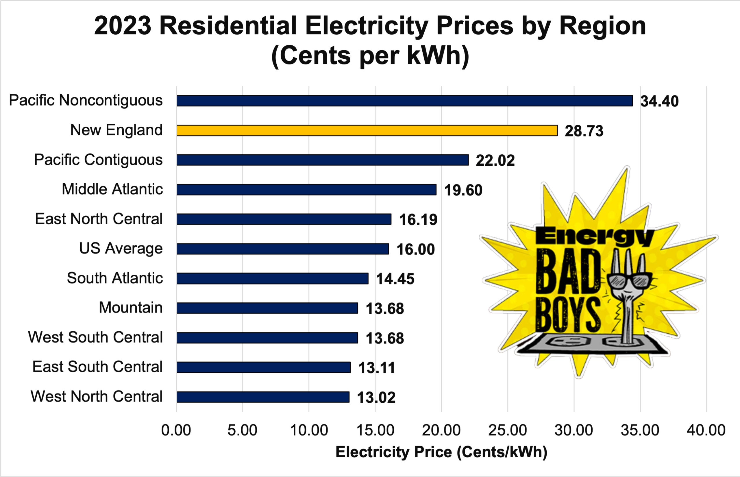 The New England region has the second highest electricity prices in the nation, as the chart below shows, and the highest in the contiguous United States.