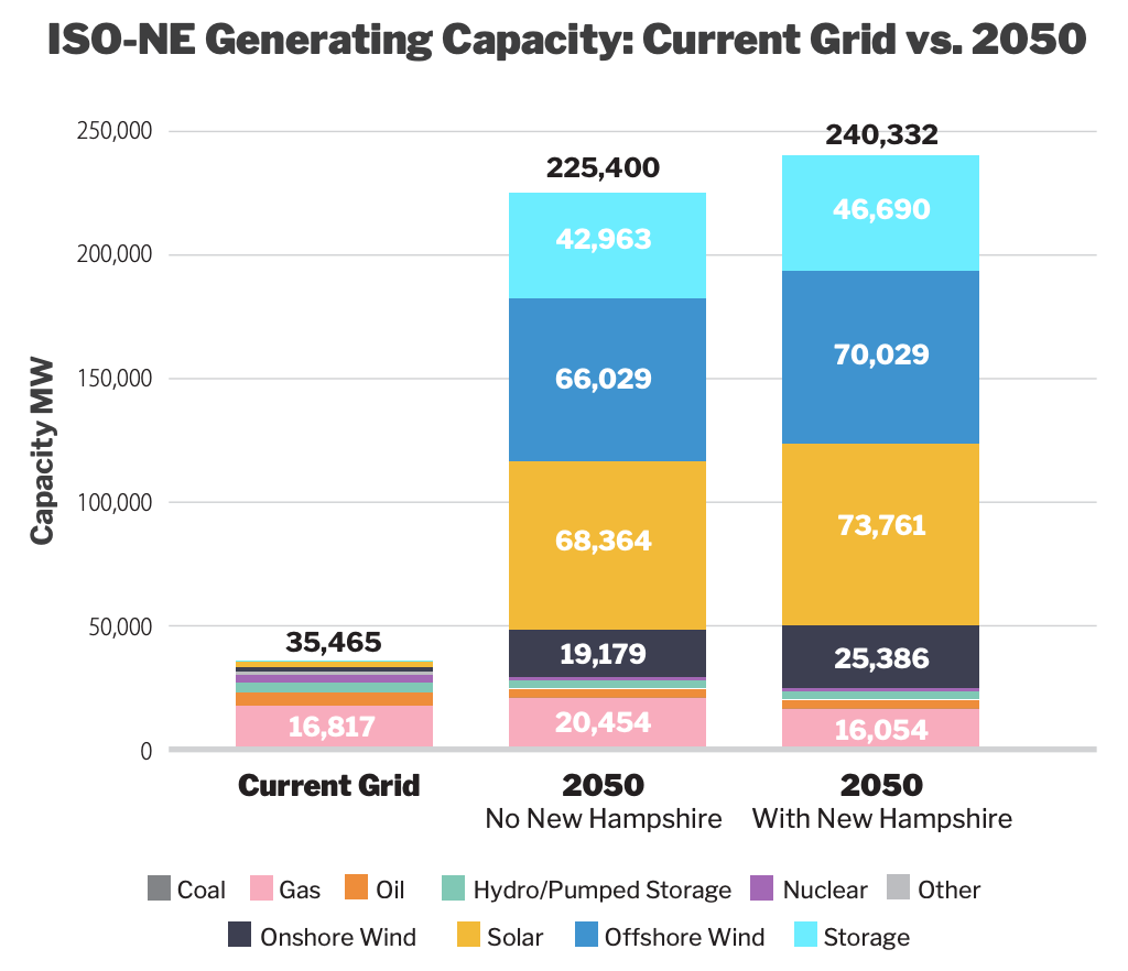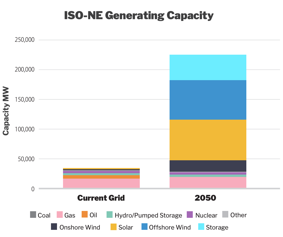 Our modeling concluded that New England would need to build 6.4 times the amount of capacity it currently has on the grid, totaling over 225 gigawatts (GW) of generating capacity (nameplate) by 2050 - up from 35 GW today. This includes 66 GW of offshore wind, 19 GW of onshore wind, 68 GW of solar, and 43 GW of battery storage. This figure also includes over 20 GW of natural gas.