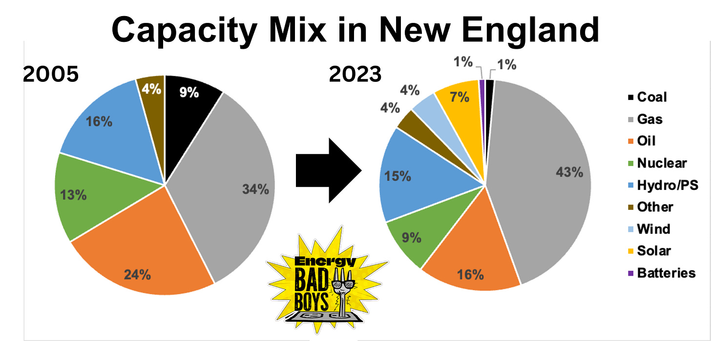 From 2005 to 2023, New England replaced roughly 5,600 MW of coal, oil, and nuclear capacity with nearly 10,000 MW of gas, wind, and solar despite electricity demand falling by 13 percent.