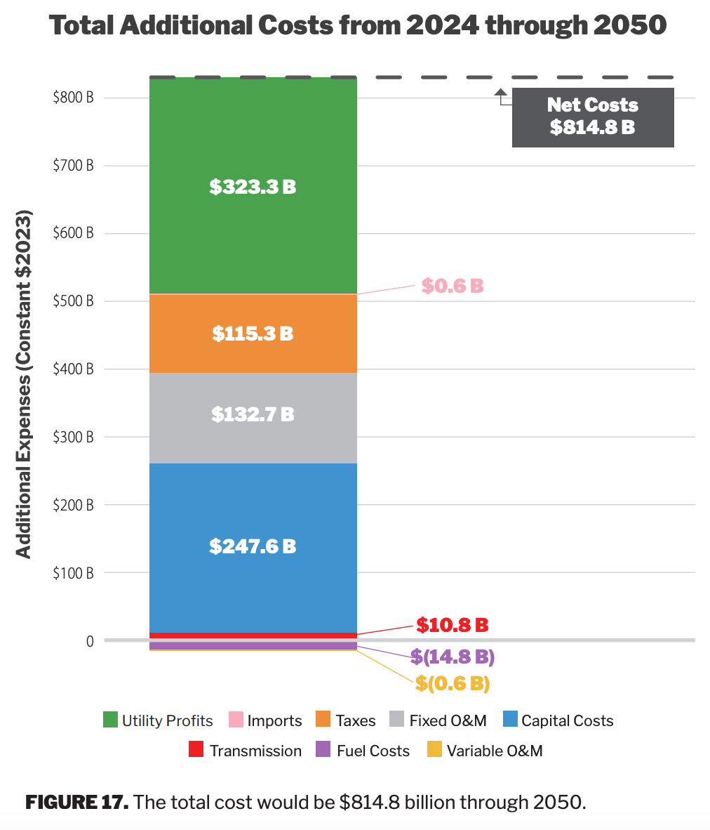 Residential customers would end up paying an extra $214 per month – or $2,500 per year – on electric bills by 2050