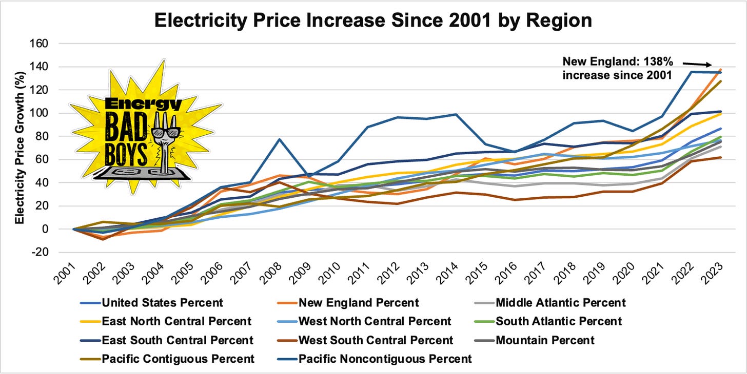 That’s because, since 2001, New England's residential electricity rates have grown at the highest rate of any other region.