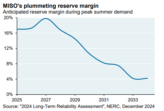 MISO continues to see its reserve margin dwindle as its margin for error sits at just four percent. The JPMC report notes MISO’s warnings of “serious challenges to grid reliability due to increased exposure to wind/solar intermittency, having averted a capacity shortfall in 2023 only due to postponement of planned thermal capacity retirements.”