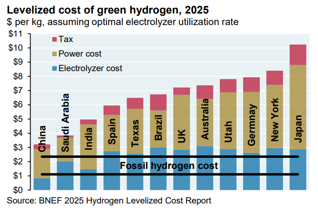 “Hydrogen has an “original sin” problem: early estimates of electrolyer costs were too low. It started with an influential IRENA paper in 2020 estimating electrolyzer costs at $750 per kW. The European Energy Transitions Commission now concedes that costs are far higher, at least when sourced from Western manufacturers; the latest estimates for 2024 range from $2,100 to $3,200 per kW. This revised assessment had led to a 5x increase in Western 2030 electrolyzer cost projections from BNEF and the Hydrogen Council relative to initial projections.”