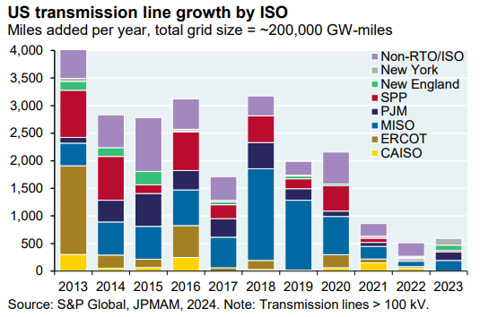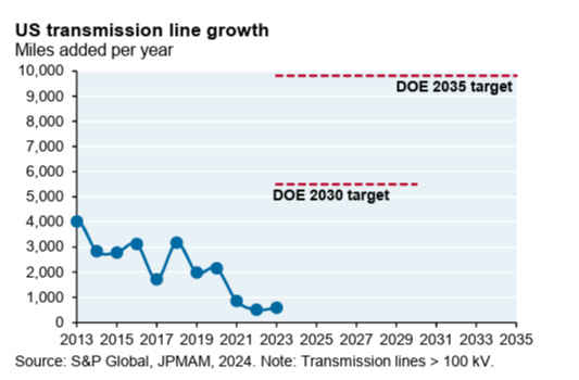 The JPMC report notes that annual additions of transmission lines are far, far below the levels envisioned by the Biden Administration’s Department of Energy, as you can see in the graph below.