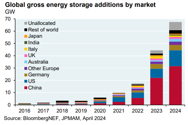 In other battery news, global storage capacity is growing quickly, with the vast majority of batteries being installed in China, the United States, and Germany.
