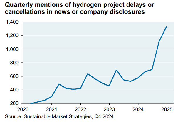 Despite heavy subsidies and much hype, the so-called green hydrogen industry is floundering. Quarterly mentions of hydrogen project delays and cancelations are skyrocketing in the news and in company disclosures.