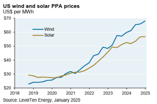 Prices are rising due to US tariffs on Chinese solar panels, a tripling of insurance premiums in MISO, ERCOT, and SPP due to weather events, supply/demand gaps due to permitting delays, higher interest rates, and increased corporate demand for green power. Keep in mind that PPAs almost always show the subsidized cost of an energy source, so in reality, the cost of these resources is even higher.