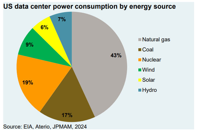 As of 2024, 43 percent of U.S. data center power consumption was provided by natural gas, 17 percent by coal, 19 percent by nuclear, 9 percent by wind, 6 percent by solar, and 7 percent by hydro.