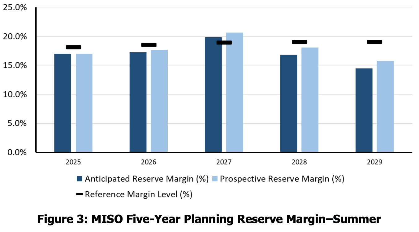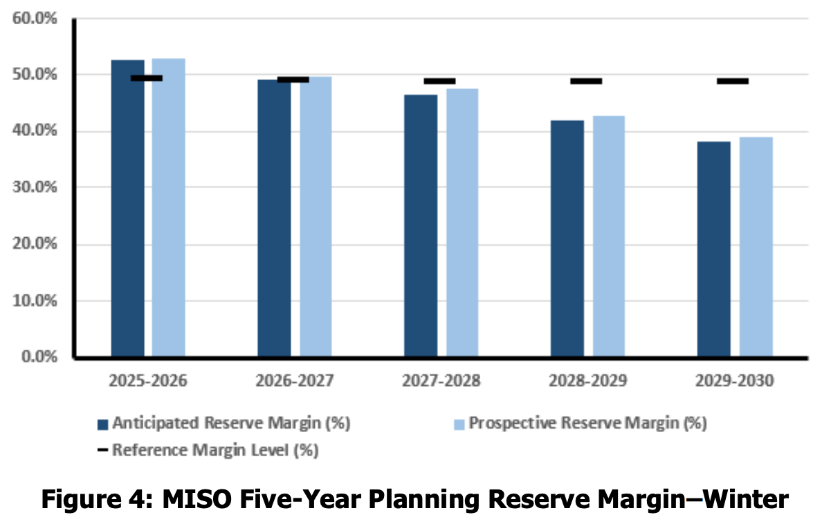 While MISO is at high risk of experiencing electricity supply shortfalls beginning in the Summer of 2025 based on planning reserve margins derived from anticipated resources and demand forecasts, it will also experience shortfalls in the winter months, as well. As the graph below shows, MISO is well below target reserve margins moving into 2029-30.