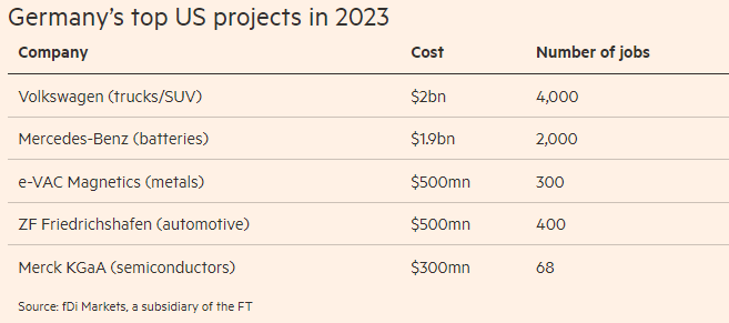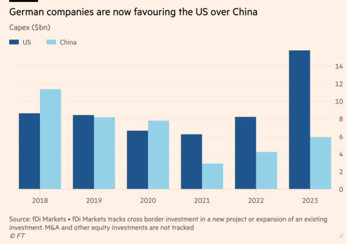 According to The Financial Times, German companies announced a record $15.7 billion of capital commitments in US projects last year, up from $8.2 billion a year earlier, according to data compiled by fDi Markets, a subsidiary of the Financial Times, dwarfing the $5.9 billion pledged in China.