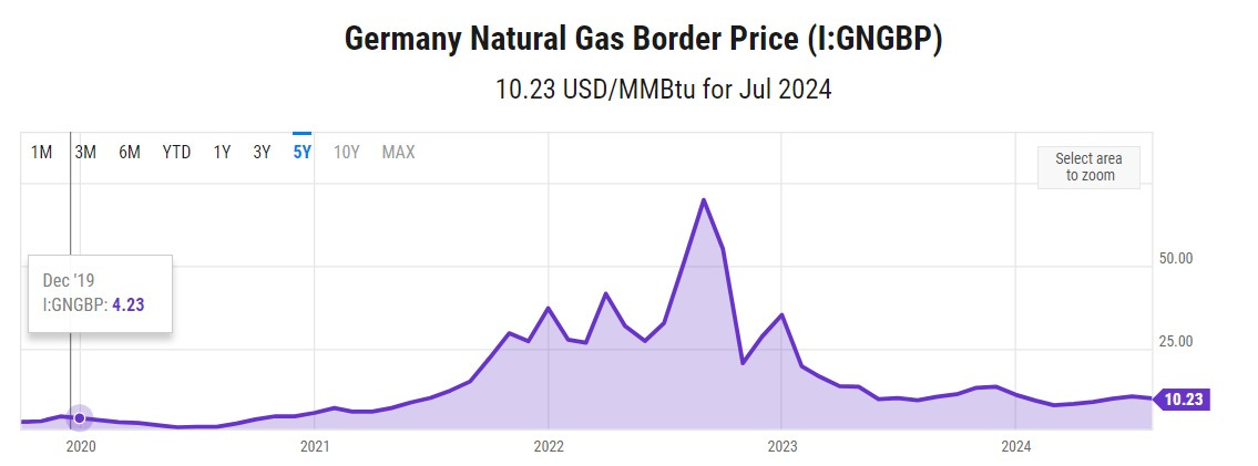 These imports have come at a cost, though. According to Y-Charts, German natural gas border prices in July were $10.23 cents per million British Thermal Units (MMBtu) compared to just $4.23 MMBtu in December 2019, harming the competitiveness of German industry.