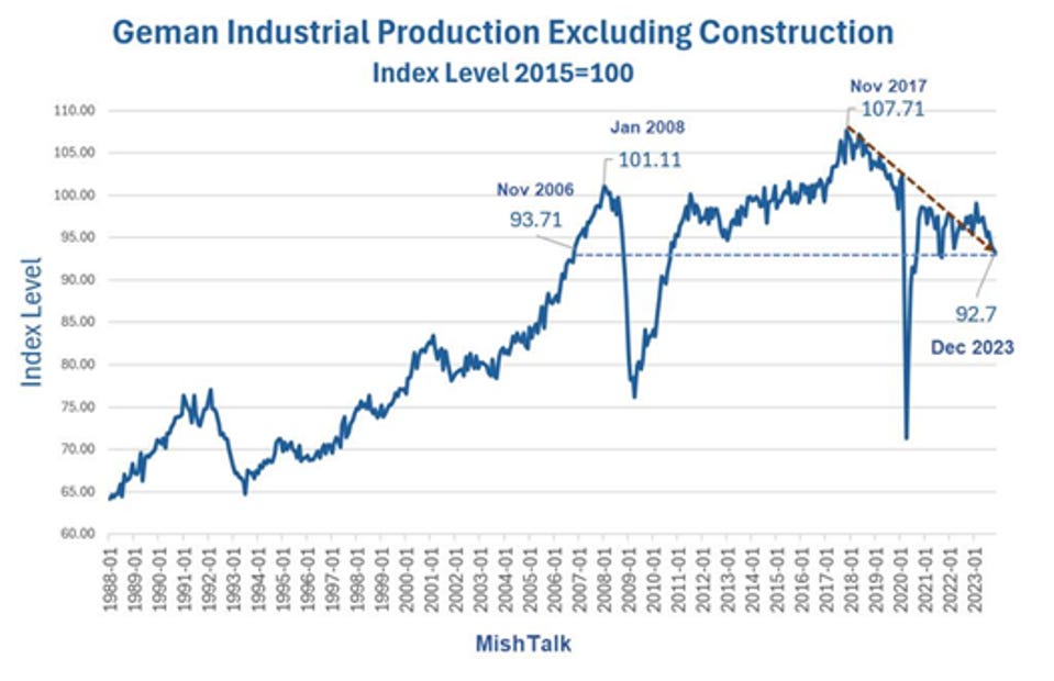 In Forbes, Tilak Doshi notes Germany’s industrial production peaked in November of 2017 and, by the end of last year, had fallen to a level last seen in 2006 outside of the global financial recession and Covid-19 years. Its industrial sector contracted by almost 14 percent in the six years ending December 2023.