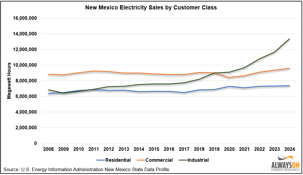 New Mexico’s electricity costs are low thanks to the oil and gas industry, which delivered the nation's lowest delivered-cost of natural gas in 2024 ($0.99 per million British thermal units). In addition, a surge in load growth to power the oil and gas industry has more than doubled the industrial electricity consumption in the state since 2008, spreading fixed capital costs over more MWhs, thus reducing rates.