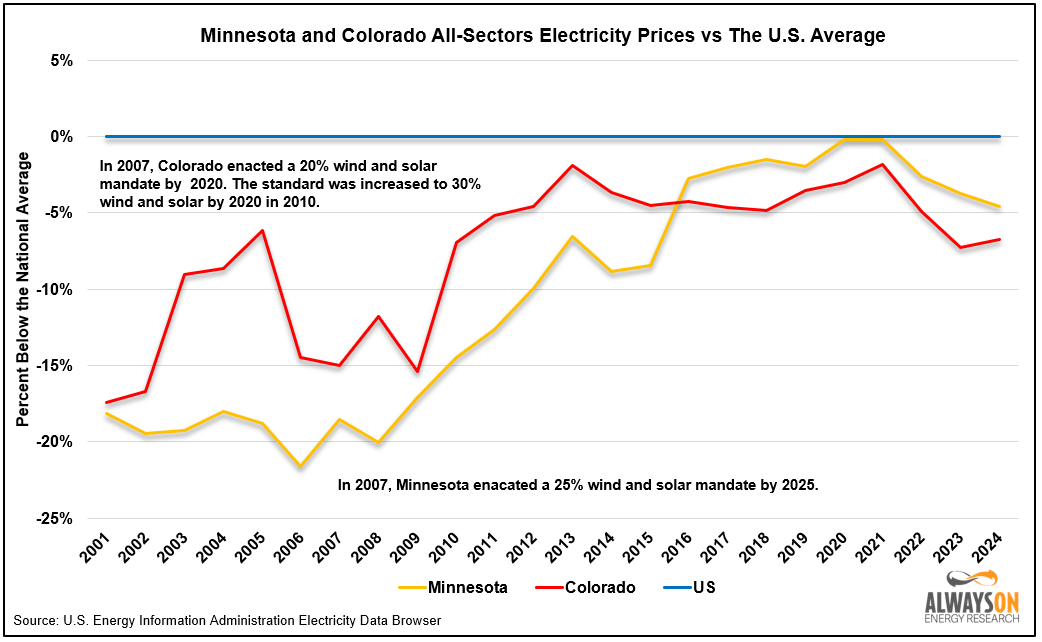Minnesota and Colorado are currently below the national average, as well, but that is largely because they started far below it. Their cost advantage has eroded dramatically after enacting wind and solar mandates in 2007.
