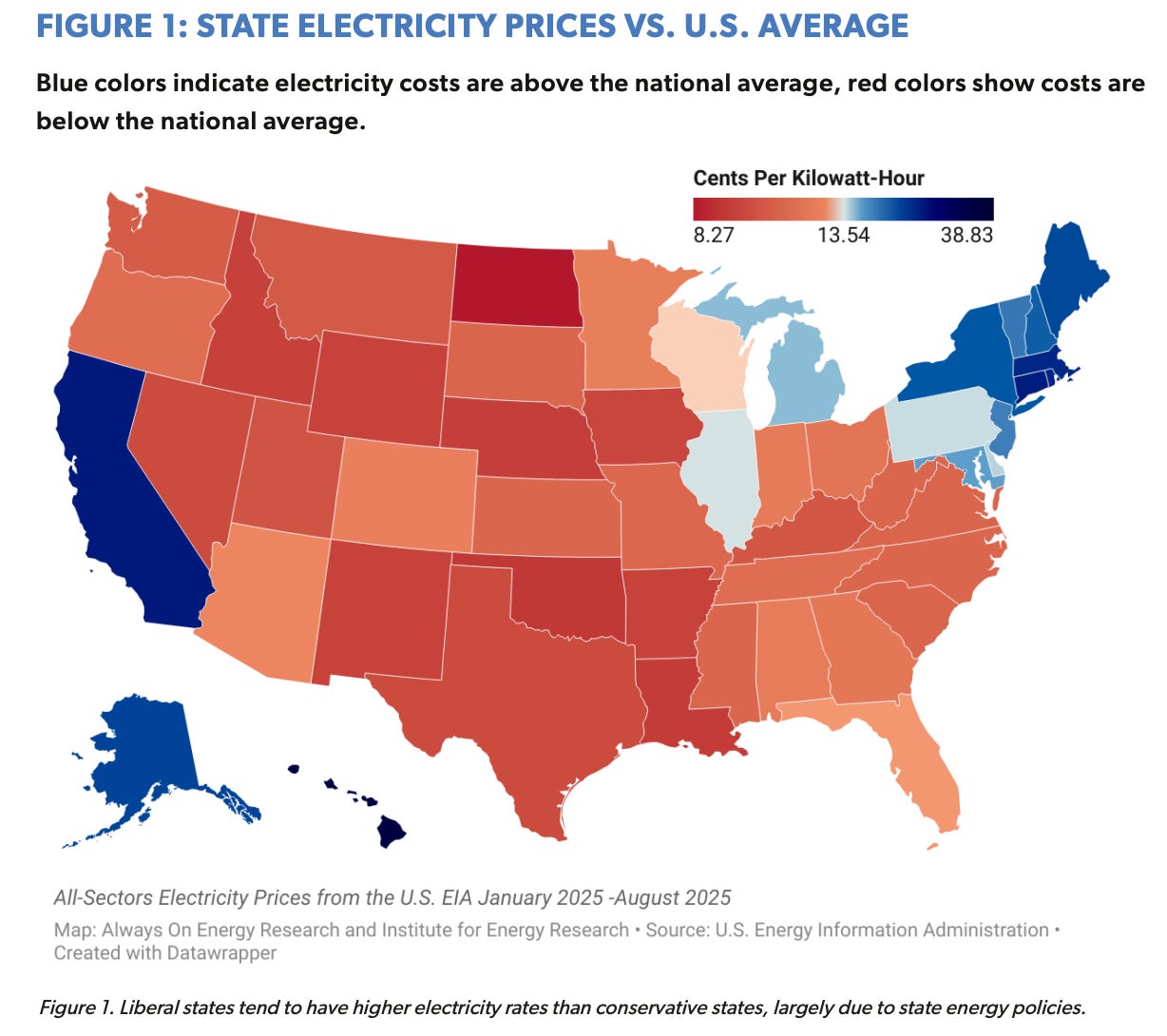 As a rule, the states that have been the most aggressive in enacting climate policies—like carbon pricing, wind and solar mandates, and rejecting pipelines—have the highest electricity costs, which we were able to demonstrate in our map from the Blue States, High Rates report, which Always On Energy Research partnered on with the Institute for Energy Research.