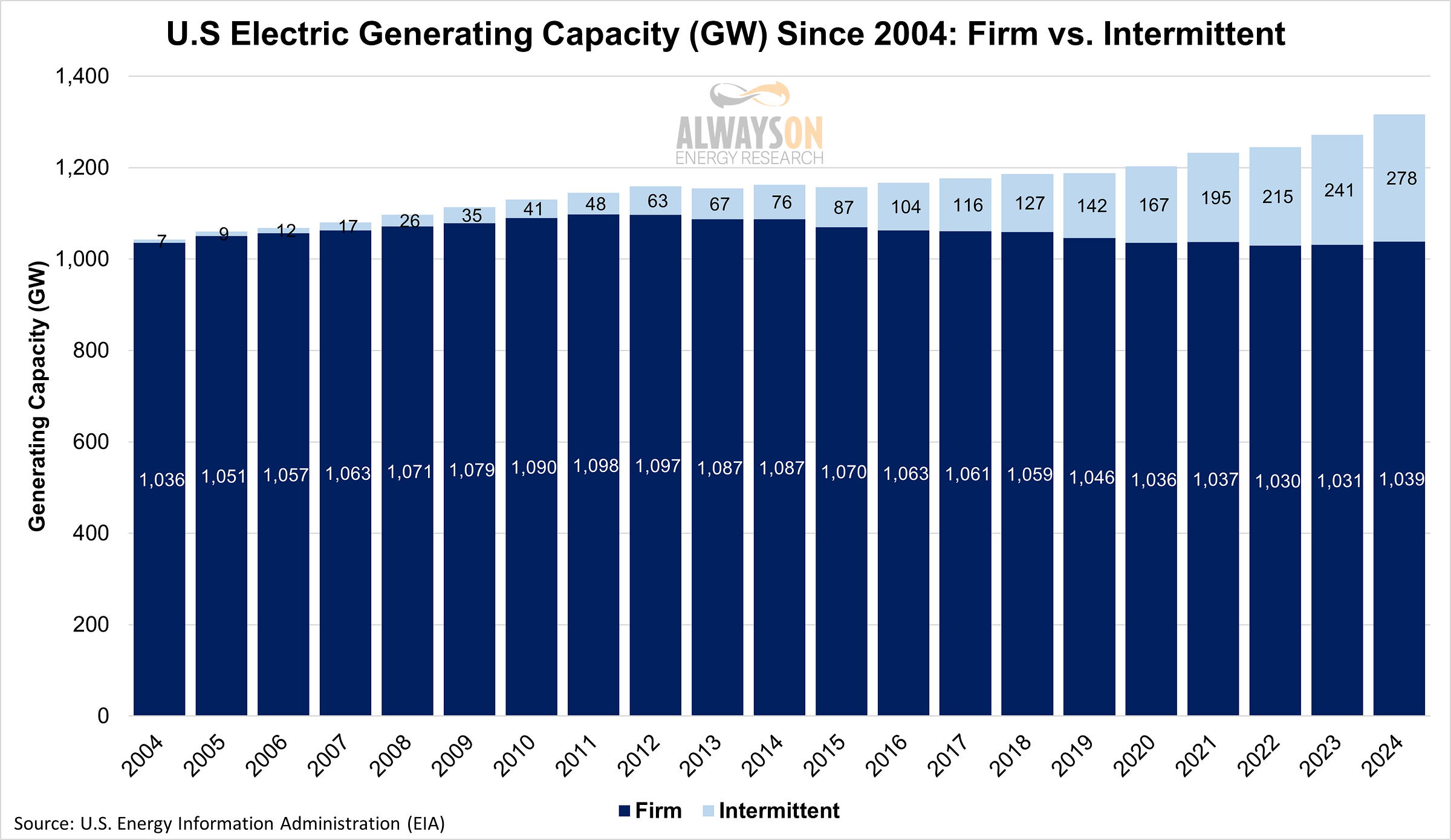 This is why despite having the most power capacity on the grid than ever before, energy supply constraints are major issues across America, because the only net capacity additions on the grid for over a decade have been intermittent wind and solar resources, whereas firm capacity (mostly coal, natural gas, and coal) peaked in 2011 and has been in a steady decline ever since. In fact, firm capacity on the grid in 2024 was back at 2004 levels when electricity demand was over 330 million megawatt-hours less.