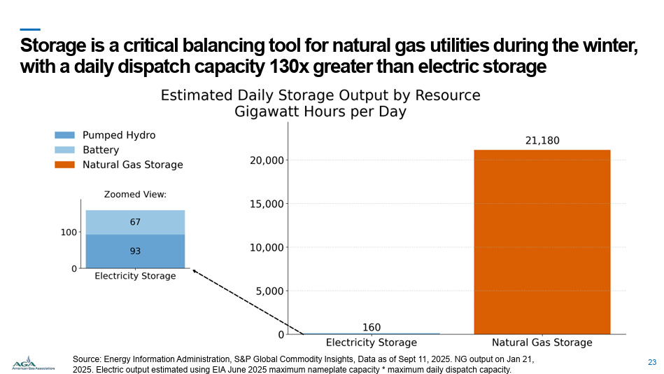 This slide will be fun to point to when wind, solar, and battery storage advocates brag about how much storage capacity is being added in the U.S. You’re adding 1,000 MW of four-hour storage? That’s cute. The U.S. has 21,180,000 MWhs of natural gas storage capacity, and building LNG storage costs 141 times less than battery storage.