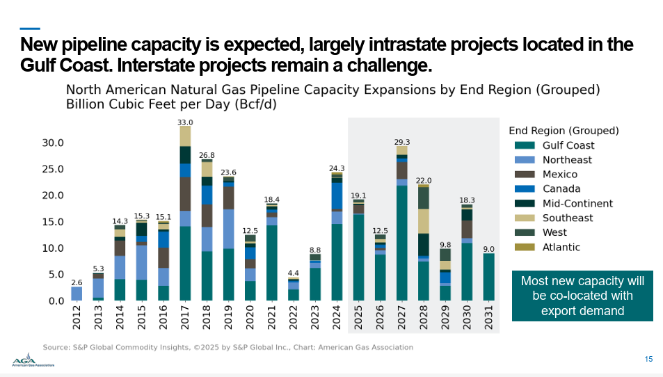 Rising natural gas production will necessitate more takeaway capacity. AGA’s slides indicate that new pipeline capacity is expected to be largely intrastate, or pipelines built within a state without crossing borders, in order to avoid onerous federal permitting challenges.
