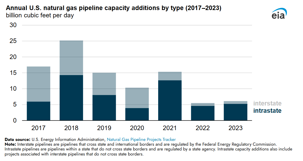 As a result, the majority of new pipelines will be built in the Gulf Coast states of Texas and Louisiana to serve domestic demand and Liquefied Natural Gas (LNG) export facilities. This continues a trend where intrastate pipeline capacity additions and expansions have far outpaced interstate additions.