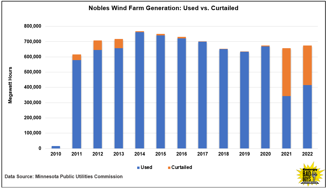 Data from Minnesota PUC filings show a large increase in curtailment at Nobles in 2021 when 47.6 percent of the potential output from Nobles was curtailed, and in 2022, when curtailment rates reached 38 percent, as you can see in the graph below.