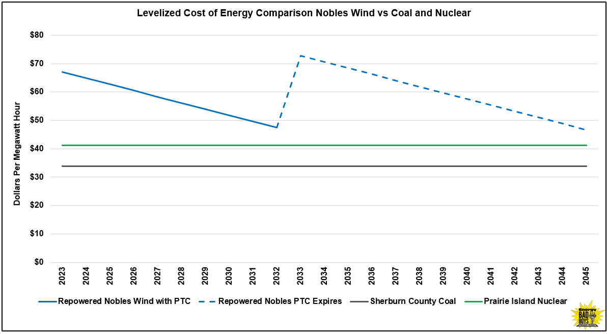 Nobles would theoretically cost less than Prairie Island in 2034, but the PTC would expire after 2032, and Nobles would go back to being 75 percent more expensive than the existing nuclear plant.