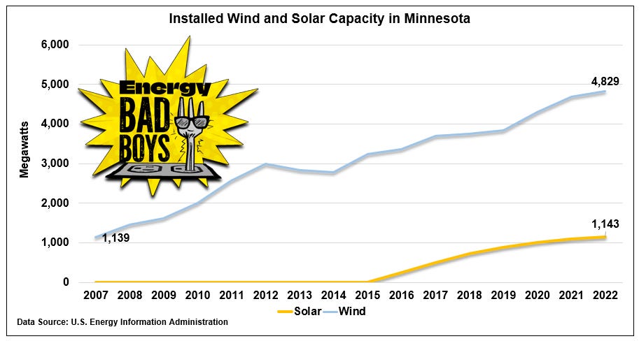 From 2007 through 2022, Minnesota built thousands of wind turbines totaling 3,690 megawatts (MW) of installed capacity and 1,143 MW of solar capacity en route to meeting the mandates in 2020, five years ahead of schedule.