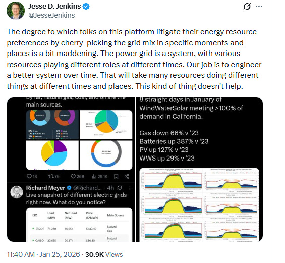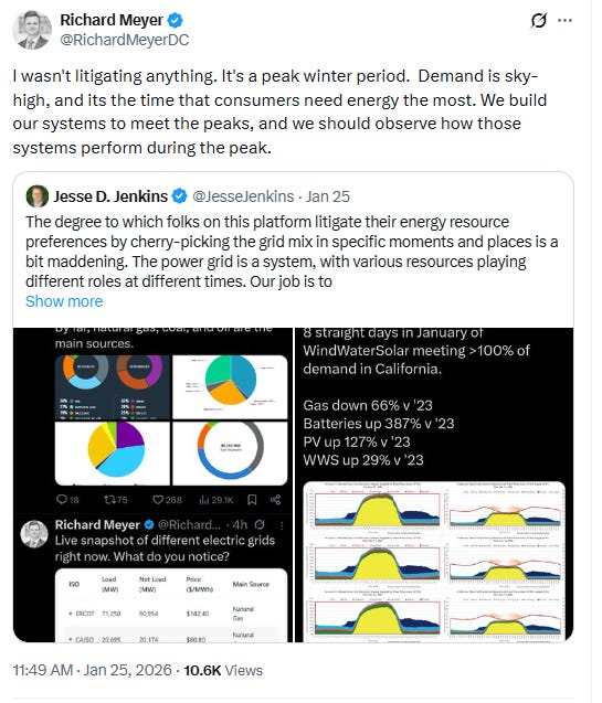 Of course, people like Jesse Jenkins took to Twitter to defend wind and solar during the storm, arguing that “different resources play different roles at different times” as an attempt to obfuscate the fact that his preferred resources were doing badly when it mattered most.