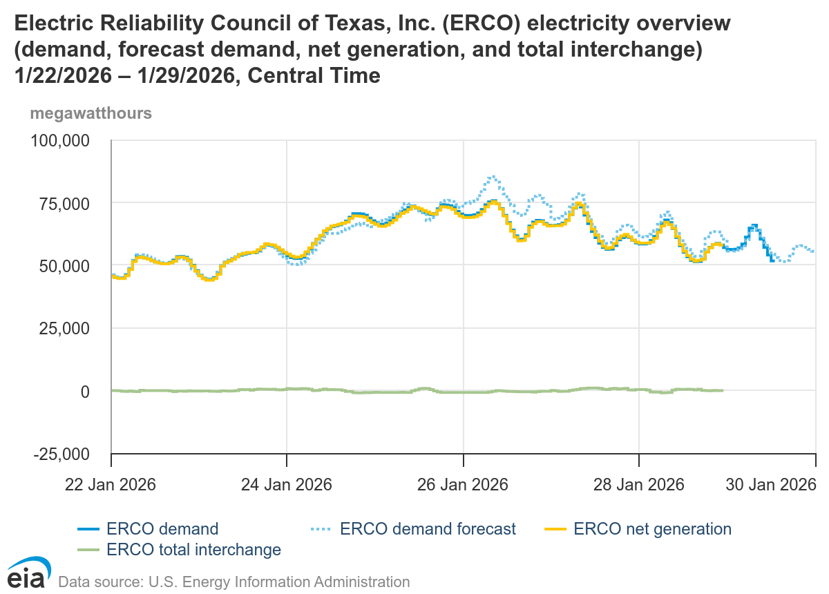 Texas may have been saved by lower power demand. According to the EIA, overall demand in ERCOT peaked on January 26th at around 75,000 MW, approximately 10,000 MW below forecast.