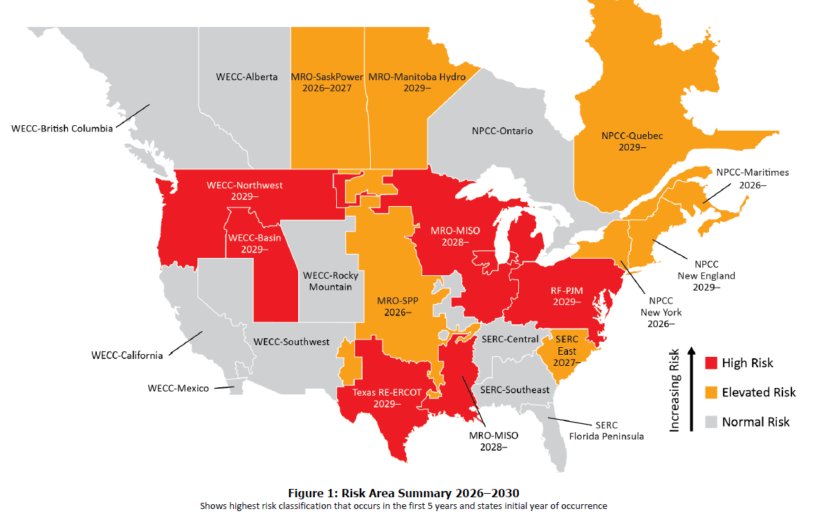 The 2026 Long-Term Reliability Assessment from the North American Electric Reliability Corporation. The map pretty much sums it up.