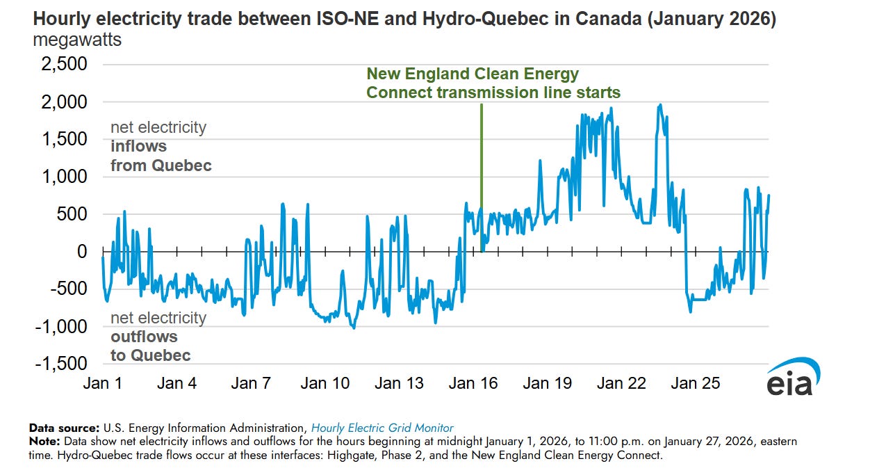 The other aspect of this story is water. Specifically, hydroelectric power that was supposed to be available to ISO-NE from Hydro-Québec via the brand-new 1,200 MW, New England Clean Energy Connect (NECEC) transmission line, which was celebrated by Massachusetts Governor Maura Healey when it was placed into service on January 16th.
