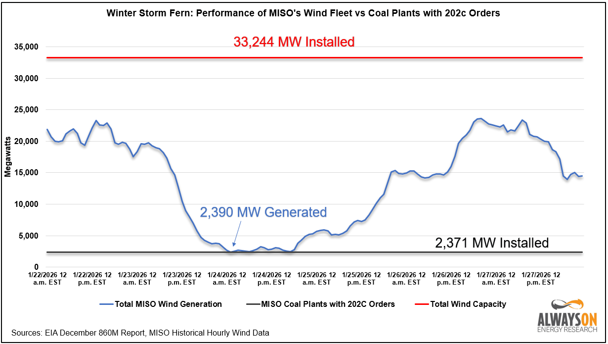 Given the wind’s disappearing act in MISO and the EEA2 declared, the Section 202(C) emergency orders issued by the U.S. Department of Energy (DOE) to keep three coal plants running in MISO look pretty smart.