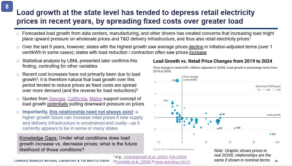 States with the highest load growth saw the average power price decline in inflation-adjusted dollars. This cuts against the narrative that AI data centers will drive up prices, but it’s not surprising that states that saw demand increases saw falling rates, because the fixed costs of the infrastructure are being spread across more megawatt-hours sold.