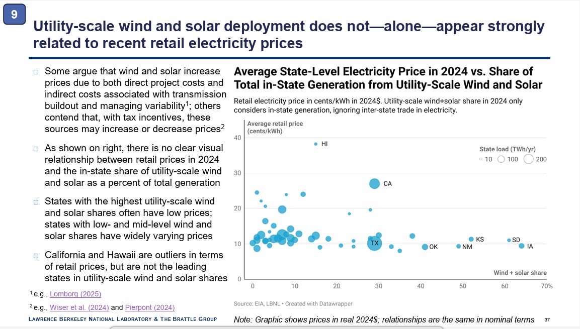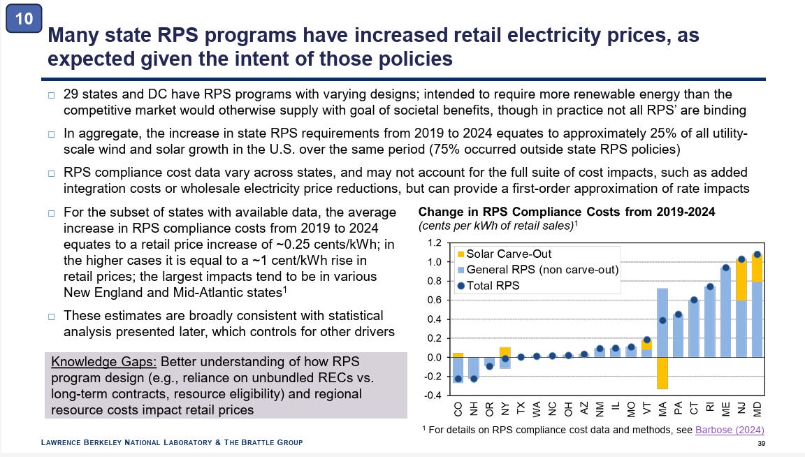 No surprises here, the states where government policies require them to purchase renewable electricity saw price increases stemming from those policies. In total, 29 states and Washington D.C. have these mandates, so it will be interesting to dig into the underlying data for this slide to see how they all measure out.