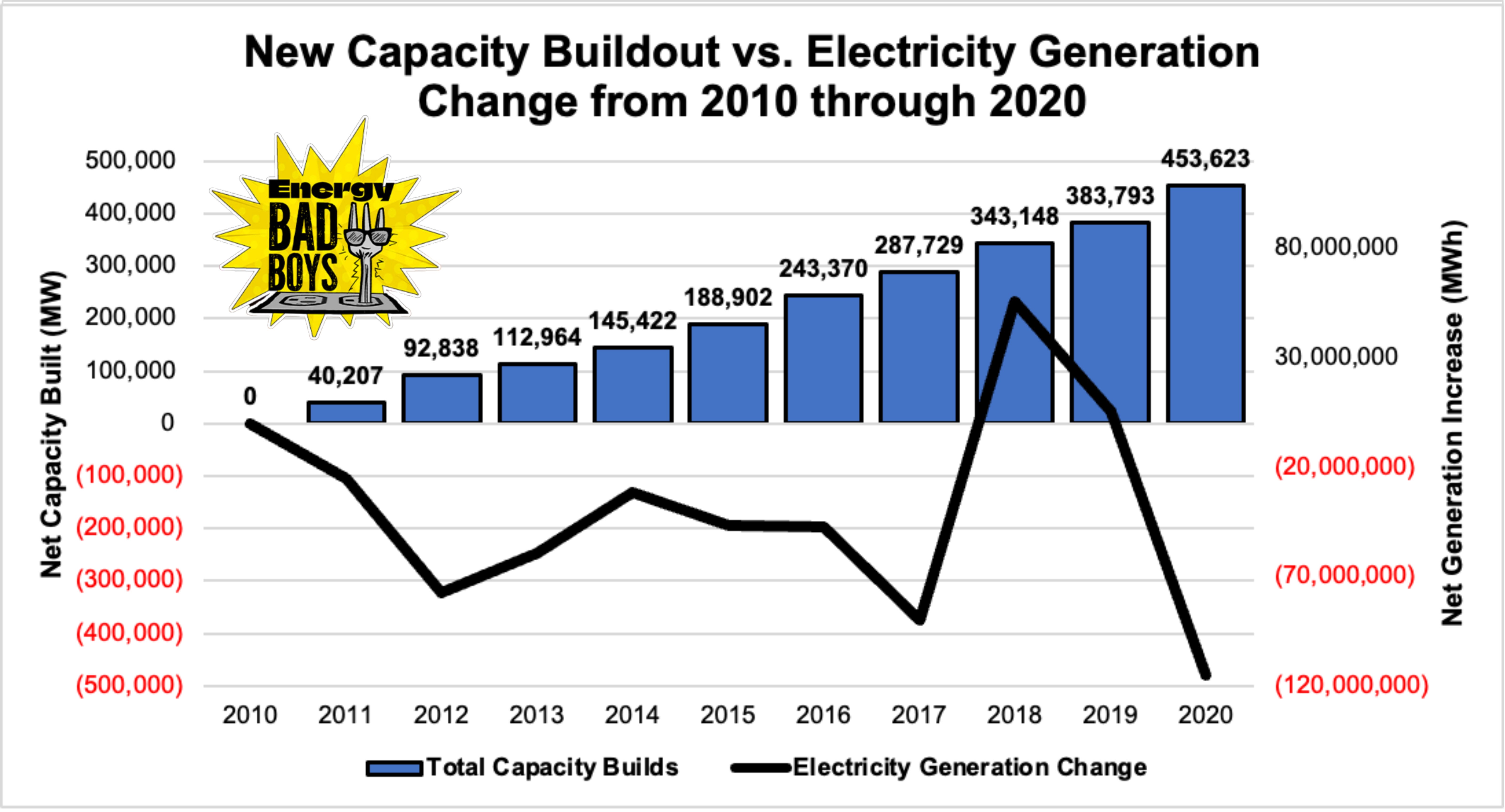 As you can see from the chart below, from 2010—2020, the U.S. electric grid built over 450,000 megawatts (MW) of new capacity even though generation was relatively flat or falling during the same period. Roughly half of these builds were wind and solar, while another 40 percent were natural gas facilities used to replace coal plants that were retired prematurely. By explaining away rising prices on inflation, one misses the fact that prices could’ve been even lower without this massive buildout of power facilities during a time of stagnate demand growth.
