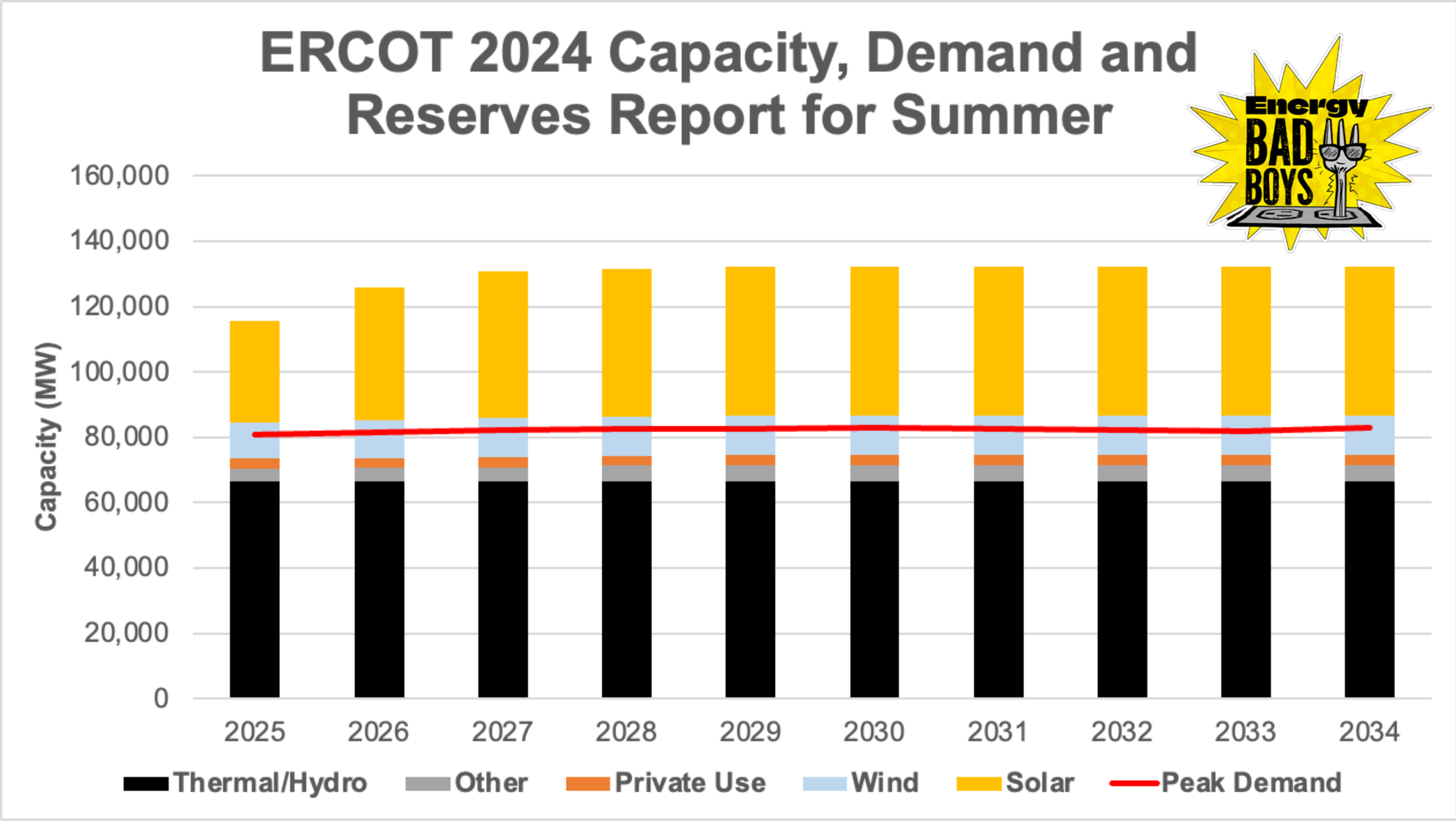 In fact, in the summer, the reserve margin in ERCOT—which represents a safety net in case of unplanned plant outages or unexpected higher demand—is made up entirely of intermittent wind and solar. As you can see in the graph below, the red line is the projected peak demand and everything above it represents the reserve margin.