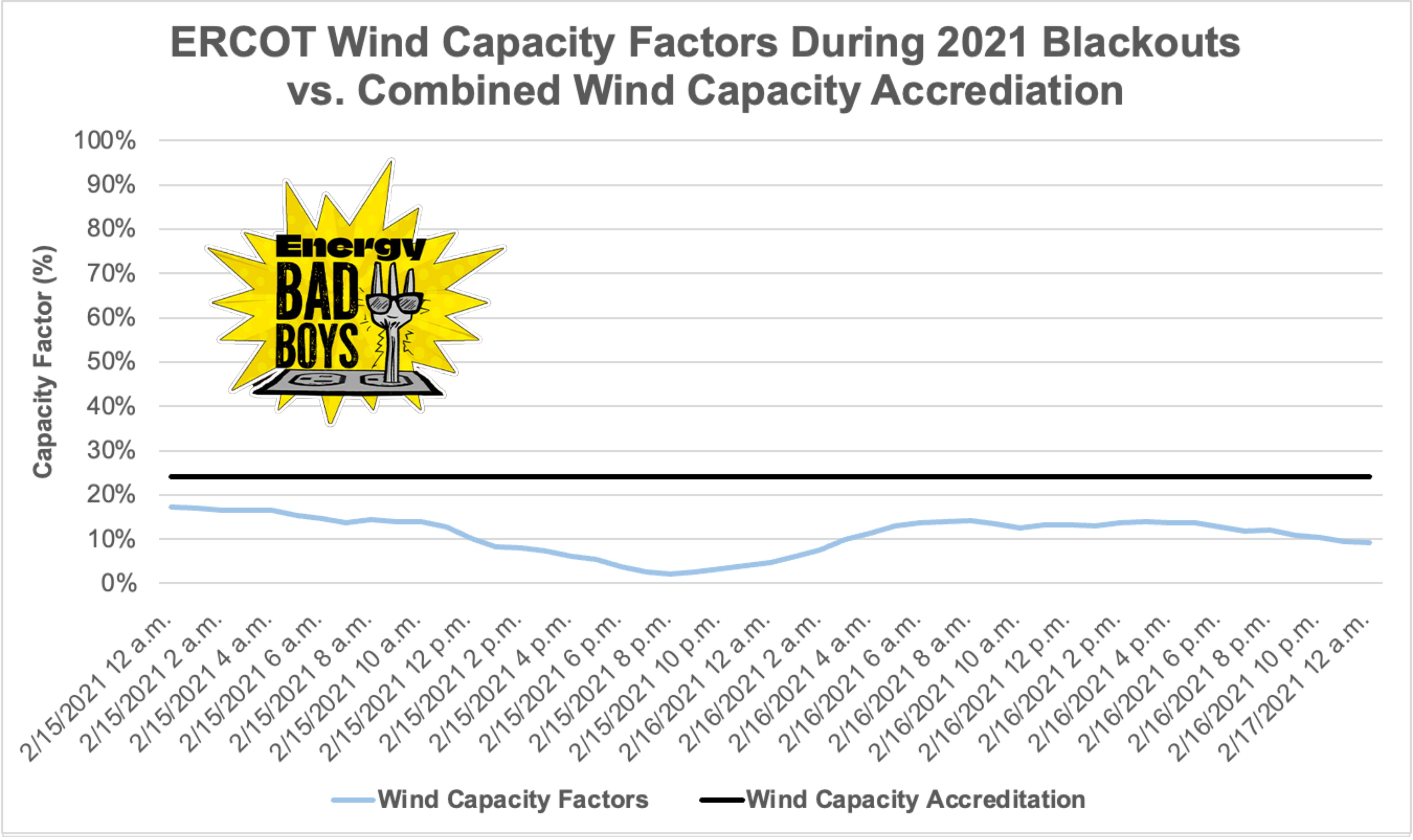 As the graph below shows, wind energy was producing nowhere near its capacity accreditation during Winter Storm Uri when the rolling blackouts ensued in Texas. At no point during the initial blackout was wind operating above its combined capacity accreditation of 24 percent (capacity-weighted) at the time.