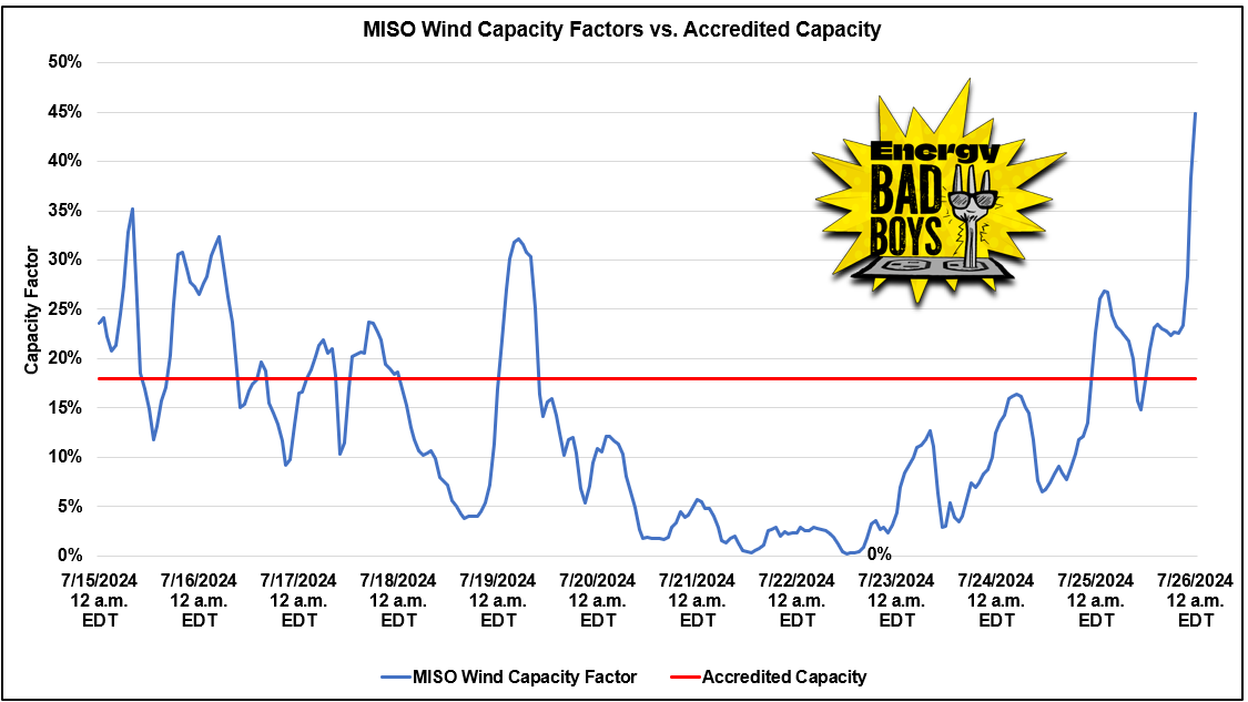 The graph below, constructed with U.S. Energy Information Administration data, shows the hourly wind capacity factors in the region and compares it to the 18 percent capacity accreditation given to wind turbines by MISO.